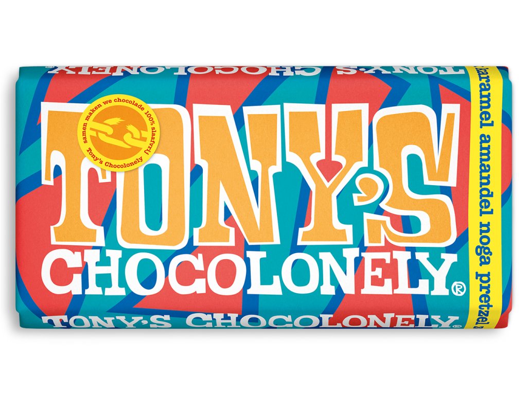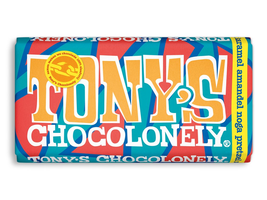 Tony's Chocolonely - mléčná čokoláda, karamel, mandle, preclíky, nugát a mořská sůl, 180 gramů