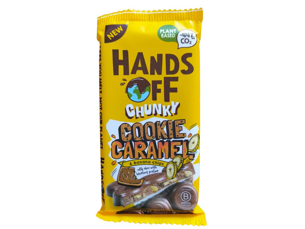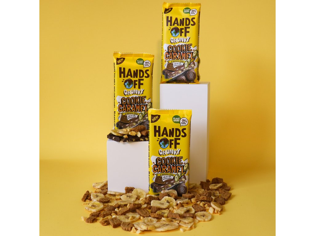 Hands off my chocolate - mléčná čokoláda, lískooříškové pralinky, sušenky, karamel a banánové lupínky, 100 gramů